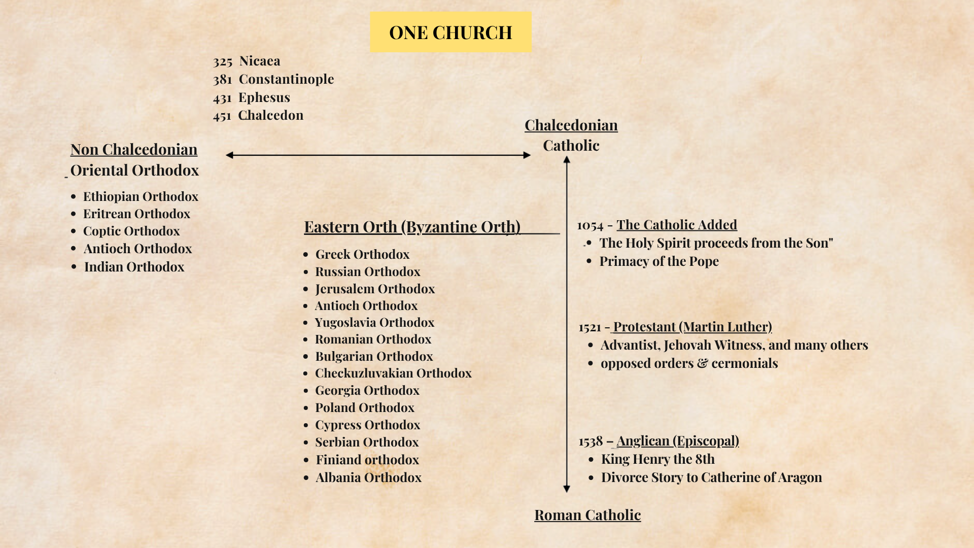 Up to the fifth century Christianity was one. The Nestorians were condemned at the Council of Ephesus in 431 A.D giving rise to the Nestorian Church Following the Council of Chalcedony in 451 A.D which condemned the so-called Monophysitcs, there arose a division which caused the separation between the Copts, the Ethiopians, the Syrians and the Armenians on the one hand and the Byzantine and Latin body of Churches on the other. In the eleventh century came the Great Schism between the Latinos and the Byzantine when the Byzantine Patriarchies in the East formed what is now known as the Eastern Orthodox Church.
